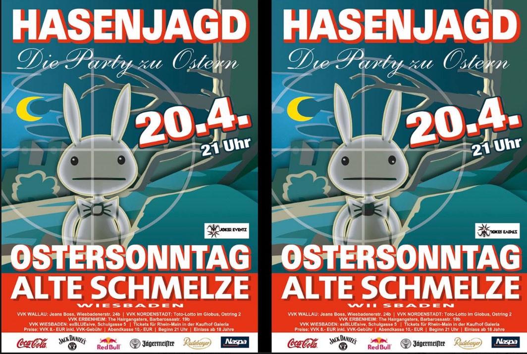 Ihr seid zum Osterfest in Wiesbaden, wo doch halb Hessen irgendwo in den Alpen zum Wintersport ist? Kein Grund Trübsal zu blasen. Blast lieber ins Horn und kommt zu uns zur HASENJAGD am Ostersonntag in die ALTE SCHMELZE.
